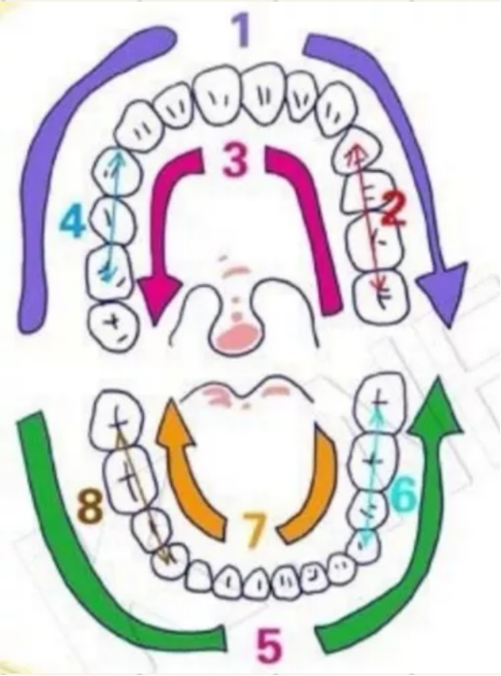 P.S. 每次刷牙时间要达到3min,保证每颗牙都有刷到;顺序原则上是右侧开始,右侧结束。