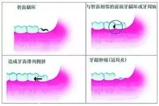 如果口腔不能为智齿提供足够的萌出空间,这时智齿往往会因为空间不足而造成异位萌出、阻生。长歪的智齿和周围的牙龈可以形成一个间隙(盲袋),就好似一个垃圾袋,食物残渣就会进入其中。