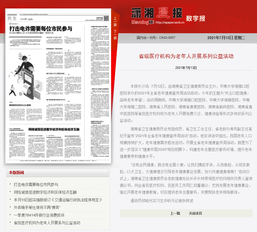 【潇湘晨报】2021年全省老年健康宣传周启动,省级医疗机构为老年人开展系列公益活动