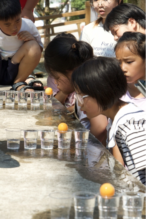随着趣味运动会的推进,乒乓球比赛开始。乒乓球,被称为中国的“国球”,是一种世界流行的球类体育项目。但是除了用球拍一来一回地较量,乒乓球还有许多其他的玩法。将橙色小球放入盛满水的杯中,用嘴吹起水花,激起气流让小球朝下一个杯中滚动,气流大小的掌控和小球滚动方向的把握都十分关键。晶莹的水花在阳光下跃动,鼓鼓的腮帮子谁也不服输,国球被玩出别样精彩。