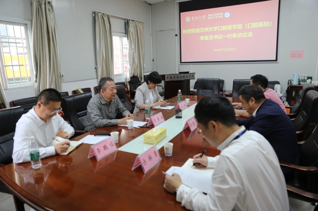 4月25日下午,兰州大学口腔医学院(口腔医院)党委书记李留浩、副院长赵媛、党委副书记李鹏程一行来访交流,院党委书记邓超纲、副书记许林勇、副院长李昆出席了座谈会。科教部、学工办有关人员参加了会议。