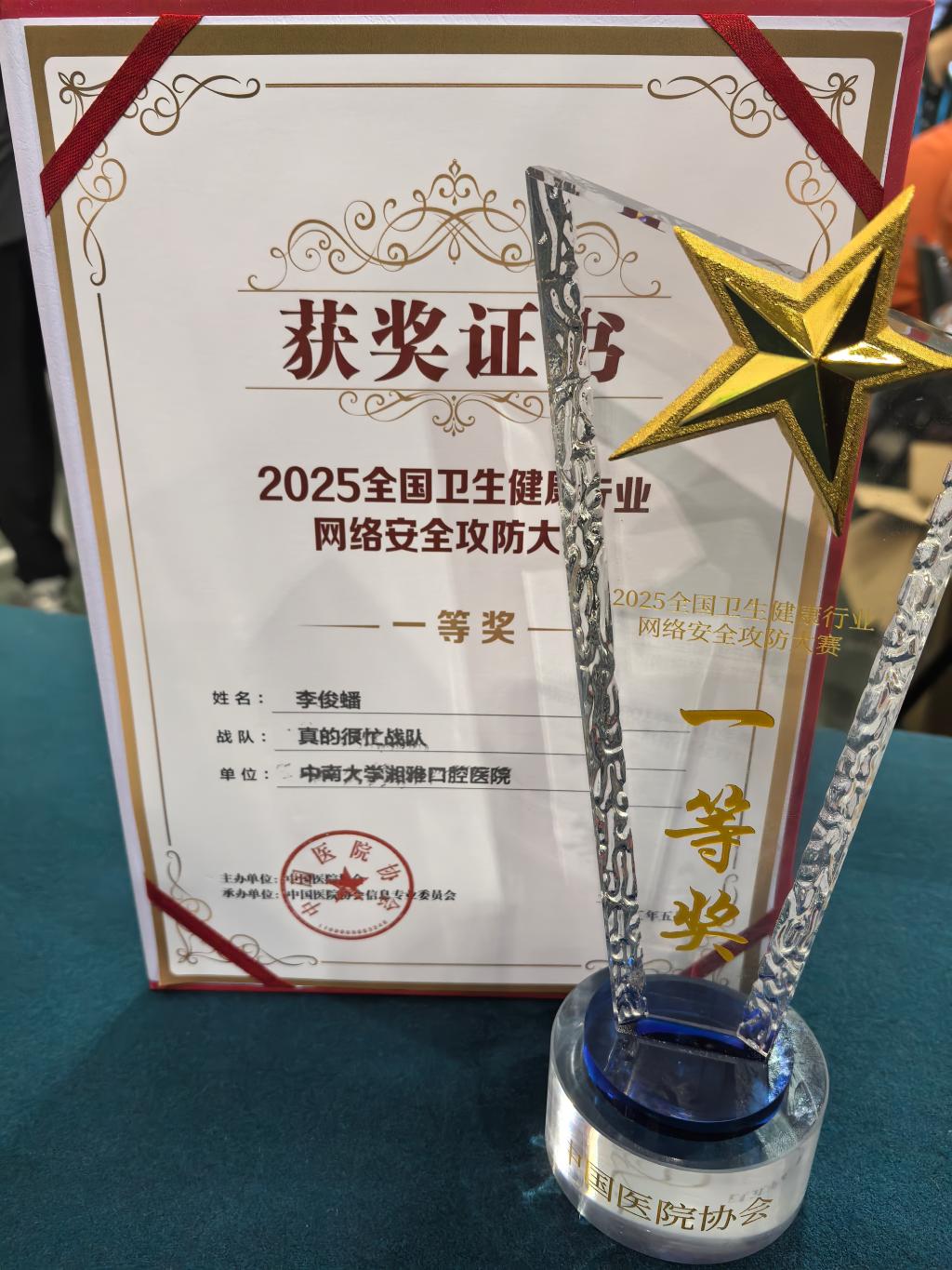 5月10日,由中国医院协会主办的“2025全国卫生健康行业网络安全攻防大赛”在厦门举行。taptap信息中心李俊蟠等组成团队在比赛中表现出色,凭借扎实的技术功底、高效的团队协作和出色的临场应变能力,获得大赛一等奖。
