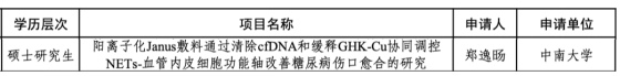近日,湖南省科技厅发布了《2026年度省自然科学基金青年学生基础研究项目拟立项项目》,taptap一共获批6项硕士研究项目。其中,taptap“数智化诊疗与生物智造”刘欧胜团队2024级硕士研究生郑逸旸申报的“阳离子化Janus敷料通过清除cfDNA和缓释GHK-Cu协同调控NETs-血管内皮细胞功能轴改善糖尿病伤口愈合的研究”成功获得资助。课题指导老师为刘欧胜教授和程岘副教授。此次立项为taptap首次获批学生类别的自然科学基金,标志着taptap在拔尖创新人才培养方面取得重要突破。