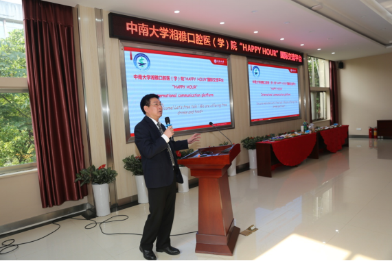 活动由科研部主任王月红主持,唐瞻贵院长、李奉华副院长、沈子华教授、陈晓婧教授以及学校国际交流处的老师们出席了活动。唐瞻贵院长在致辞中指出搭建“Happy hour”国际交流平台旨在建立国际化校园人文环境,促进多种文化的相互学习,提升taptap师生的国际化视野。同时,他希望通过该平台将“百年湘雅”的精神在中外学生中发扬光大。