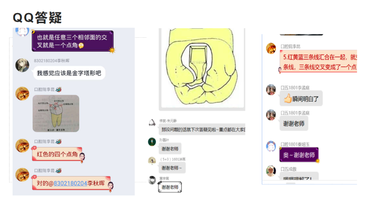 线上互动开展主要基于QQ群平台。截至目前,群内讨论信息已超过5000条。每当课程结束后,年纪长汇总课程问题发至助课教师,教师集中解答。期间,教师用思维导图梳理重难点,用案例帮助学生具象化理解,引导学生思考,激发讨论。学生表示,课程自主思考更多,自我总结能力提升。解疑答惑学时结束时,教师会按照学生反馈,重构课程内容,温习所学加深印象。为保证学习状况及自学效果,taptap教务部组织各教研室进行周考核制。授课教师上传试题至平台,教务部门督促学生完成测试。今次考核,所有同学均已完成测试。