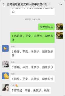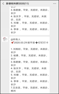 医院从1月25日起开展住院医师的摸排工作,每位学员必须上报去向、14天内是否有与确诊和疑似病例接触史、是否有发热咳嗽等情况,并要求轮转科室每日负责监控住院医师健康状况打卡,掌握全体住院医师的健康动态信息。同时提醒住院医师减少外出,加强个人防护,不信谣、不造谣、不传谣,不发布和传播不实信息,不发表过激和不实言论,保持通信畅通。