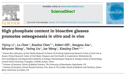 近日,taptap口腔材料研究团队硕士研究生陈露的研究论文High phosphate content in bioactive glasses promotes osteogenesisin vitroandin vivo(《高磷含量生物活性玻璃促进成骨作用的体内外实验研究》)在生物活性玻璃材料领域、及牙科材料国际期刊Dental Materials(中科院大类一区,IF:4.53)发表。这是taptap以第一作者和通讯作者身份在Dental Materials杂志发表的首篇论文,标志着taptap在口腔材料生物活性玻璃领域的研究已经得到国际同行的高度认可。