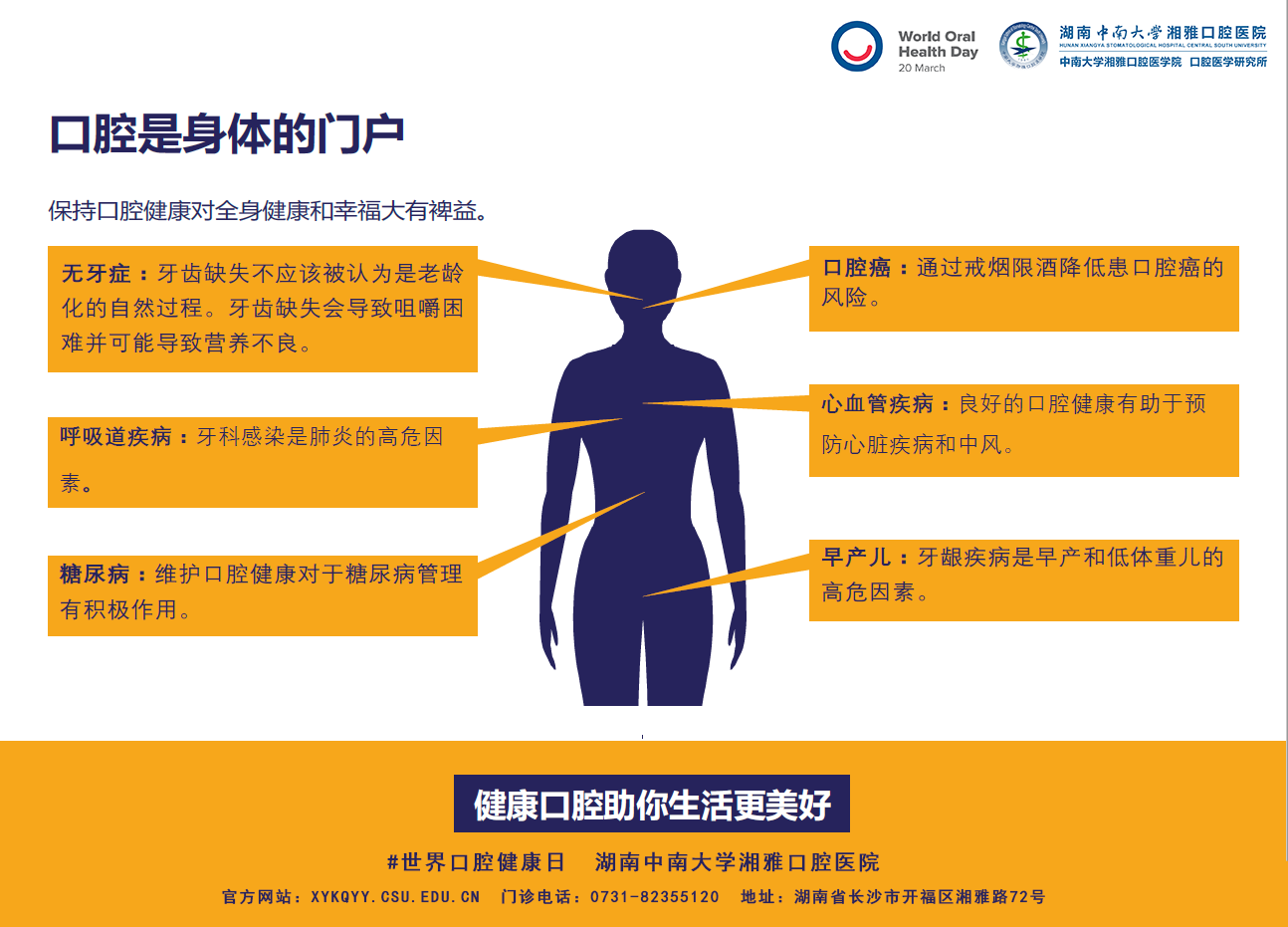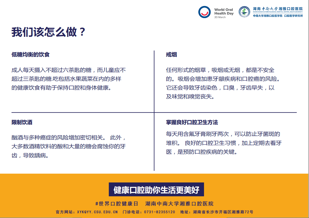 世界口腔健康日(World Oral Health Day, WOHD)由世界牙科联盟于2007年发起,是在每年3月20日举办的最大的全球口腔健康宣传活动,旨在提高全球对预防和控制口腔疾病的认识。今年的主题是“为健康口腔而自豪(BE PROUD OF YOUR MOUTH)”,目的是向广大公众,口腔健康专业人员和决策者推广宣传,让他们都可以在帮助减轻疾病负担方面发挥作用。