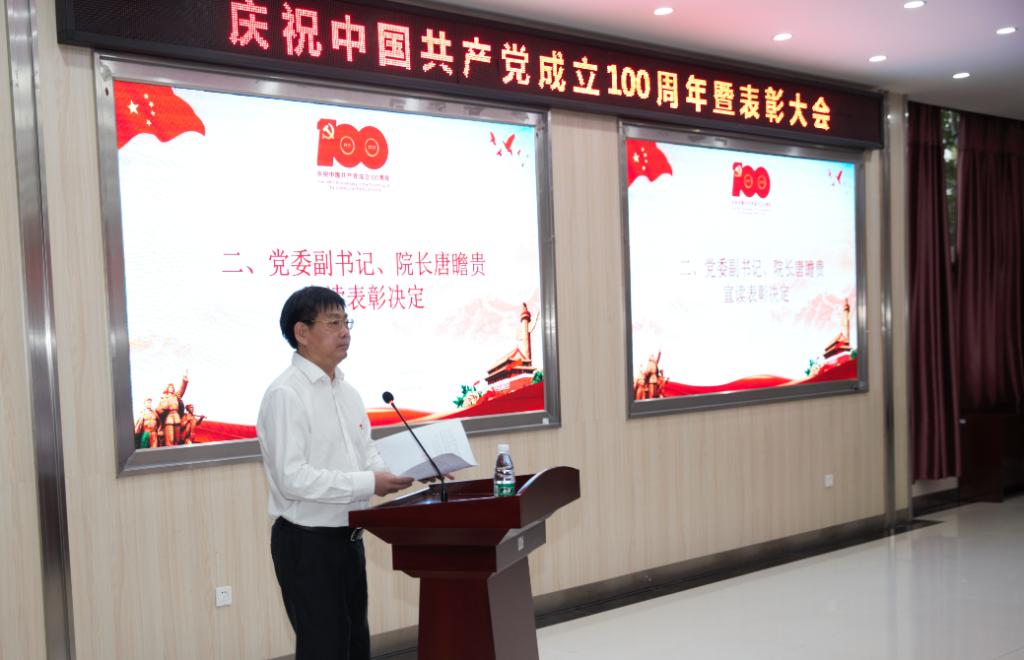 院党委书记邓超纲首先向受表彰的先进集体和个人表示祝贺,向全院共产党员致以节日的问候。他在讲话中与大家共勉了习近平总书记在“七一勋章”颁奖仪式发表的重要讲话精神,希望全院党员同志坚定信念,坚持不忘初心、牢记使命,为党的理想信念顽强奋斗、不懈奋斗;践行宗旨,想群众之所想,急群众之所急,解群众之所难,密切联系群众,坚定依靠群众;拼搏奉献,把许党报国、履职尽责作为人生目标,不畏艰险、敢于牺牲,苦干实干、不屈不挠;廉洁奉公,保持共产党人艰苦朴素、公而忘私的光荣传统。