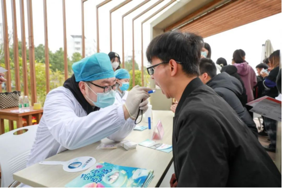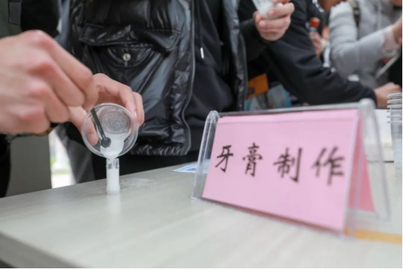 宣教结束后进入义诊、制作牙膏和知识问答游戏环节。义诊台前同学们排队接受专业口腔医生检查,唐瞻贵院长、牙周科彭倩医生、牙体牙髓科罗骏思医生给出建议;蒋琼瑶老师、陈周老师为同学们示范正确高效的刷牙方式;牙膏制作活动中,工作人员指导同学们运用小苏打、水合硅石、椰油等材料制作白净清香的牙膏;问答桌旁同学们依次挑战口腔相关问题;参与过的同学凭借积分券抽取口腔护理礼品。