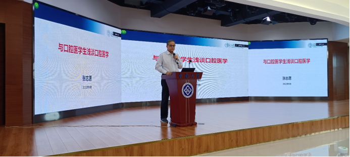 张志愿院士从认识口腔医学、学好口腔医学、做好口腔医生三个方面给同学们授课。他通过讲述口腔医学发展简史,口腔医学与其他医学门类的关系,以及口腔疾病与全身健康的密切相关,使同学们认识到作为口腔医生的职责和使命。希望同学们树立学科交叉意识,树立勇于开拓的创新思维,做到心怀感恩和爱心、树立远大理想抱负,做富有责任、敢于担当、努力拼搏和无私奉献的“口腔卫生事业的脊梁、中国梦的践行者” 。