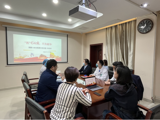 11月18日中午,第四党支部组织党员深入学习传达贯彻党的二十大精神。支部书记陈晓婧以《“医”心向党,不负韶华》为题讲党课,并带领党员进行学习研讨。